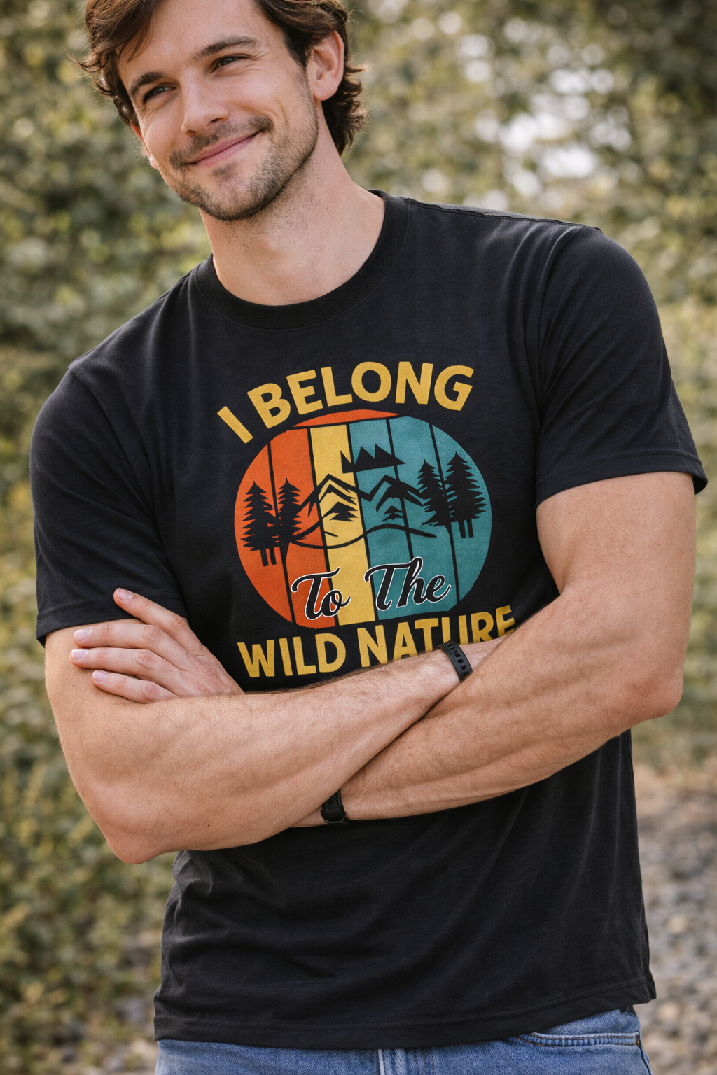 Design grafic: compoziție circulară inspirată din natură, cu munți, brazi și apusuri stilizate pe fundal în nuanțe calde și reci, completată de mesajul inspirațional I Belong to the Wild Nature