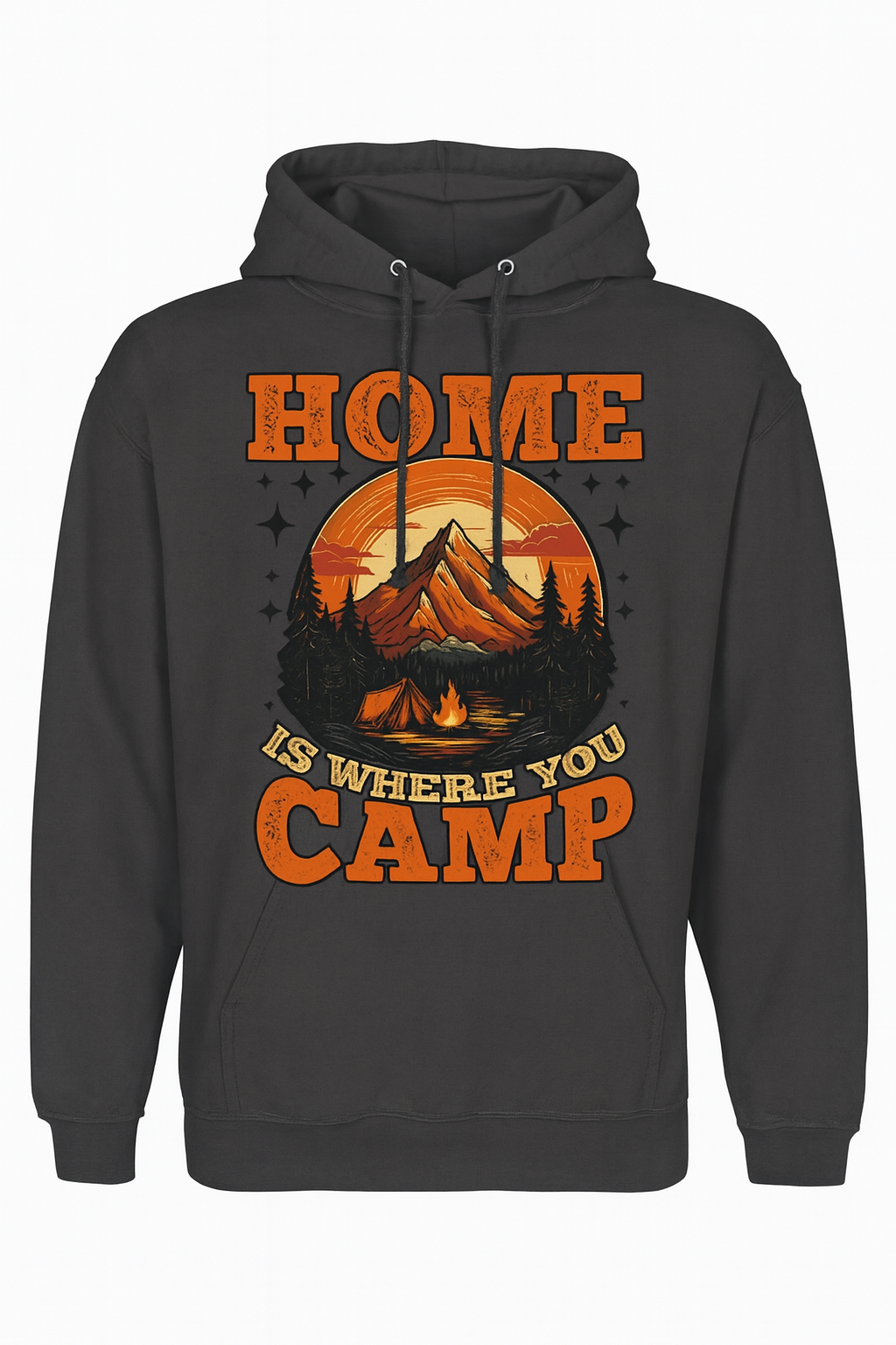 Pe partea frontală, hanoracul prezintă un imprimeu retro spectaculos, cu munți, păduri de conifere, un cort luminat de focul de tabără și un apus cald în nuanțe de portocaliu și galben intens. Mesajul „Home is where you camp” subliniază ideea că adevărata casă este acolo unde găsești liniște și libertate în mijlocul naturii.