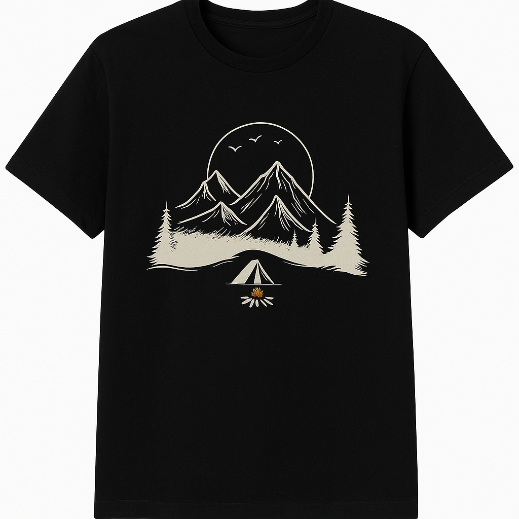 Tricoul Camp & Chill este simbolul libertății și al momentelor simple petrecute în mijlocul naturii. Designul minimalist și expresiv surprinde esența unei seri perfecte de camping: munții care domină orizontul, pădurile liniștite, un cort așezat la poalele muntelui și un foc de tabără pregătit să adune povești. Totul sub lumina calmă a lunii, cu păsările ce zboară deasupra, conturând un tablou de liniște și echilibru.