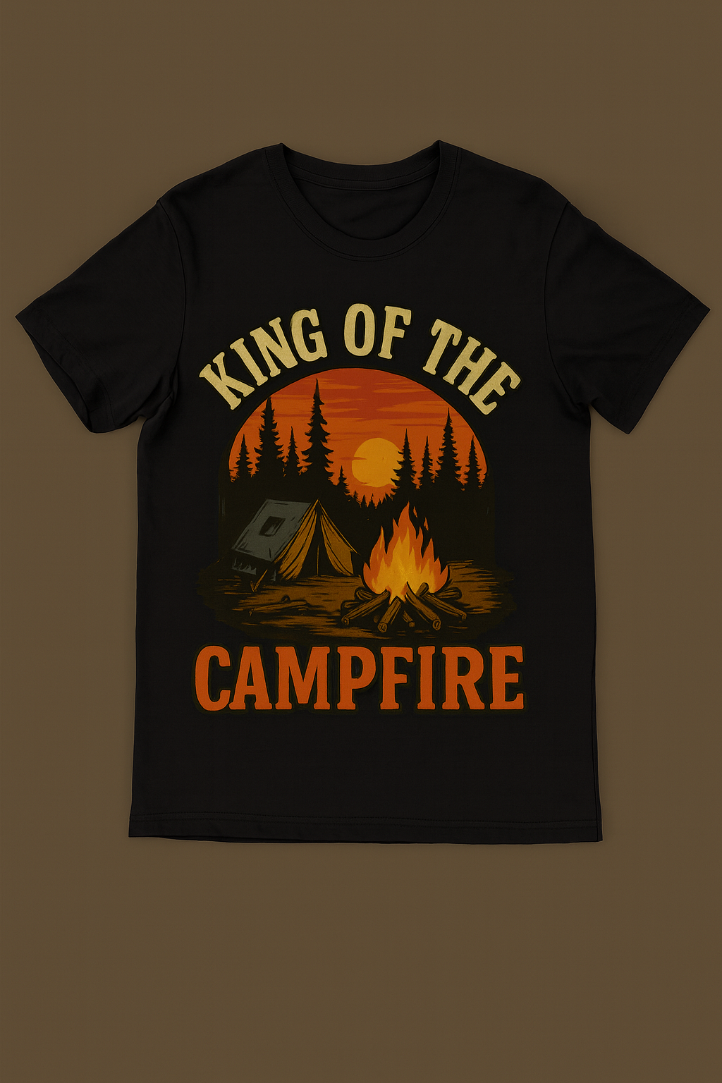 • Design grafic: scenă rustică ce surprinde atmosfera campingului – un cort așezat în mijlocul pădurii, un foc de tabără luminos și un apus spectaculos, totul completat de mesajul inspirațional King of the Campfire
