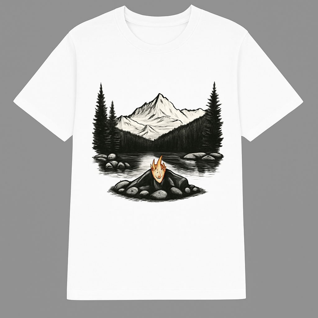 Tricoul Echo of Silence surprinde într-un design artistic liniștea naturii neatinse și frumusețea momentelor petrecute departe de agitația urbană. Grafica minimalistă, dar expresivă, ilustrează un foc de tabără aprins pe malul unui lac liniștit, înconjurat de brazi și dominat de silueta unui munte impunător acoperit de zăpadă. Această scenă evocă echilibrul, calmul și puterea conexiunii cu natura sălbatică.