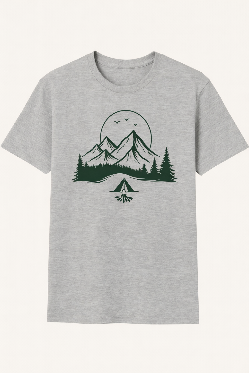 ✔️ Design simplu, dar puternic – munți, cort, pădure și foc de tabără
