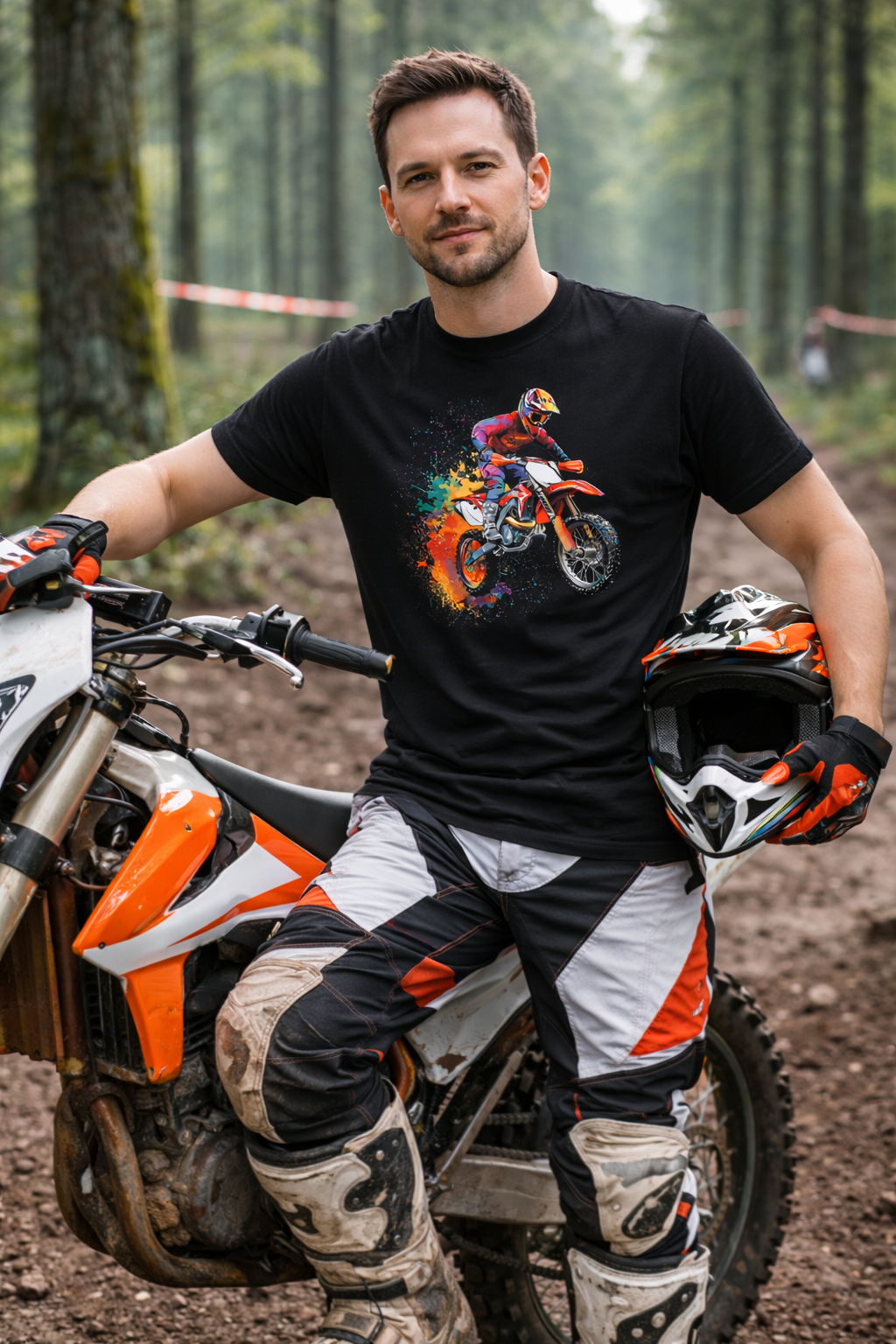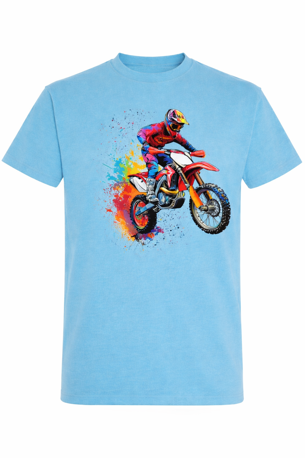 Tricoul „Ride Free” este creat pentru iubitorii de adrenalină, sport și libertate. Designul dinamic cu motociclist motocross în săritură și explozie de culori transmite energie, mișcare și spirit aventurier, fiind alegerea perfectă pentru cei care trăiesc intens fiecare zi.
